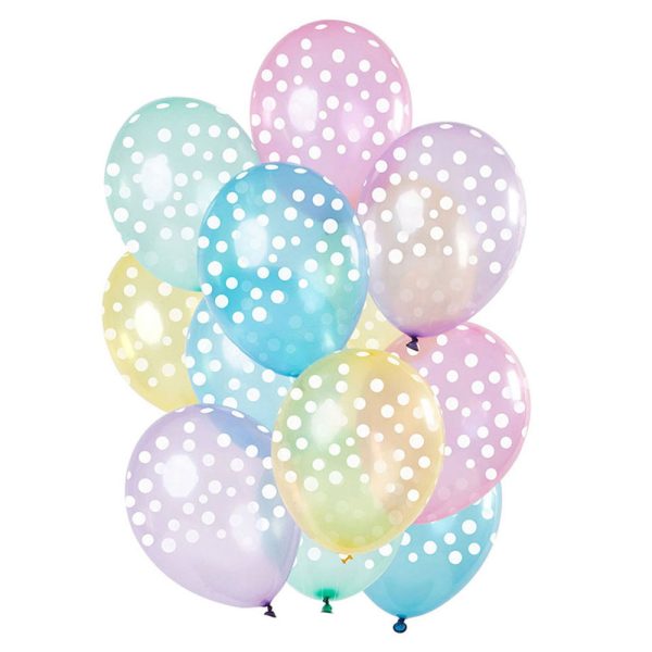 Med ett gäng latexballonger som dessa kan du på ett riktigt enkelt sätt dekorera din fest som ett proffs! En färgsprakande ballongmix med 12 stycken genomskinliga och prickiga ballonger i flera olika färger som garanterat kommer att liva upp hela ditt firande. Passande latexballonger till alla färgglada kalas och fester i regnbågsfärger.