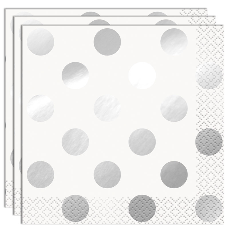 Prickiga Kaffeservetter Silver består av ett 16-pack vita servetter med prickar i silver. Ena sidan av servetten har skimriga silverprickar och andra sidan har matta silverprickar. Servetterna har 2 lager och är tillverkade i papper.