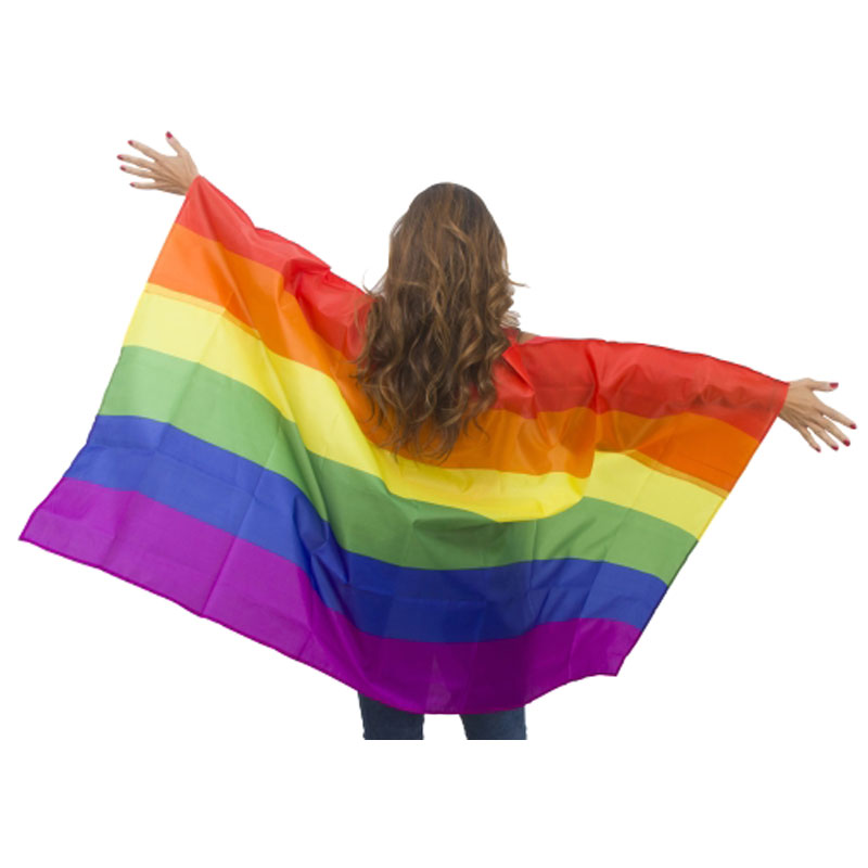 Prideflagga Cape omfattar en snygg cape med ärmar och är i färgerna röd, orange, gul, grön, blå, lila och mörklila.