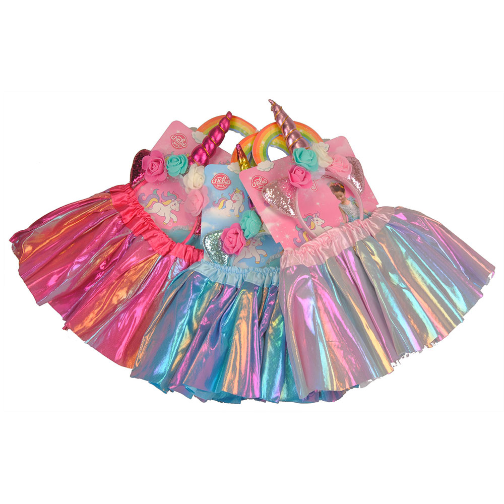 Prinsess Kjol och Diadem Enhörning omfattar en skimrande kjol och diadem med glittriga öron, ett horn och låtsasblommor i olika färger. Finns i färgerna ljusrosa, ljusblå och rosa, vilken du får blir en överraskning.
