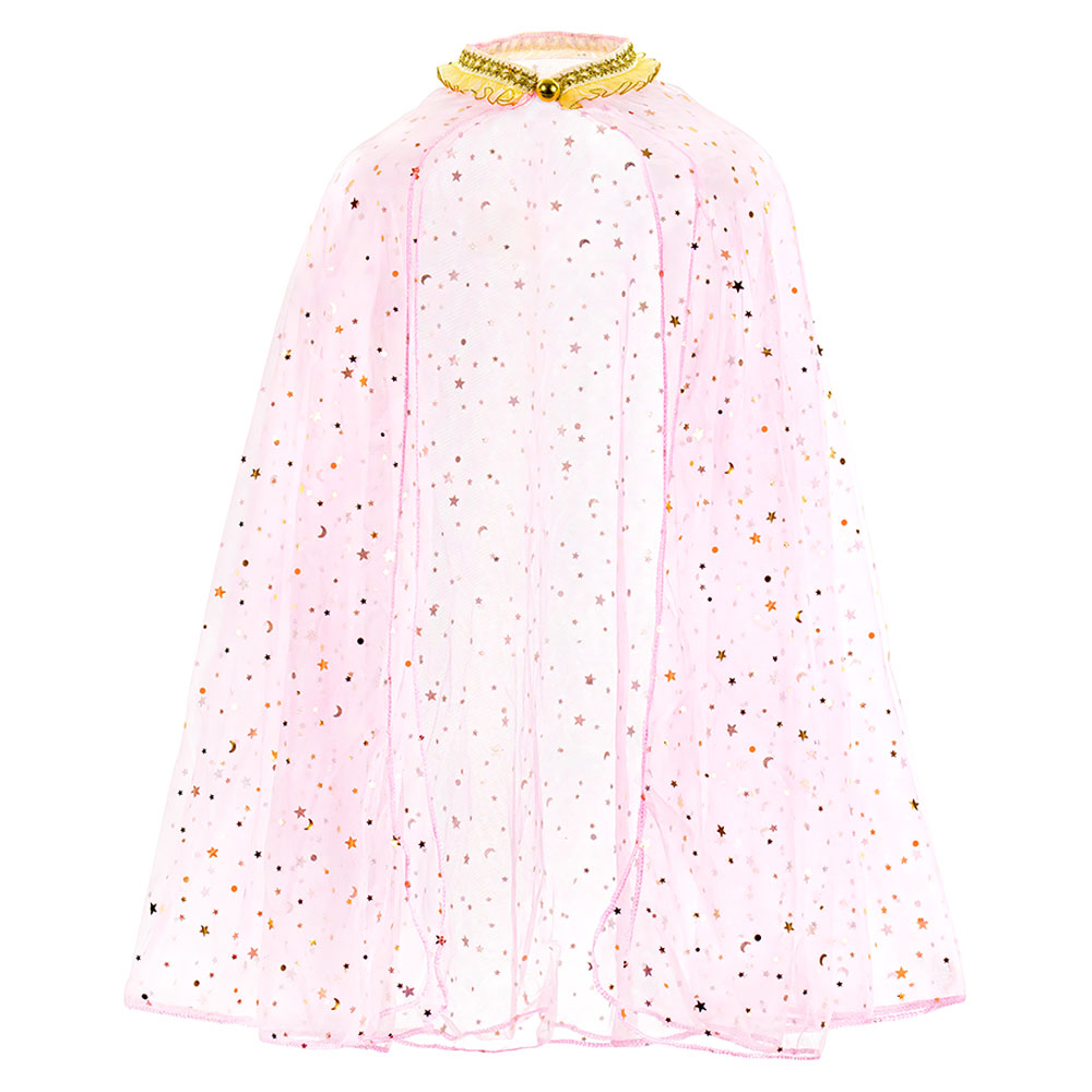 Prinsessa Barn Mantel Rosa och Guld omfattar en mantel i rosa polyester med guldigt mönster med stjärnor, månar och prickar, och guldigt band och knäppning upptill.