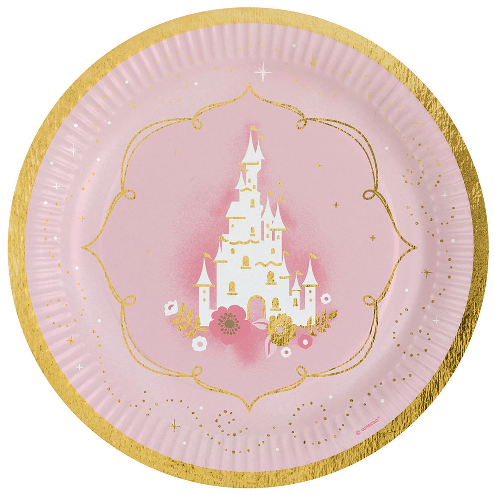 Prinsessa För En Dag Papperstallrikar omfattar 8 stycken rosa engångstallrikar i papper med ett motiv av ett sago-slott. Tallrikarna är ca 23 cm stora.