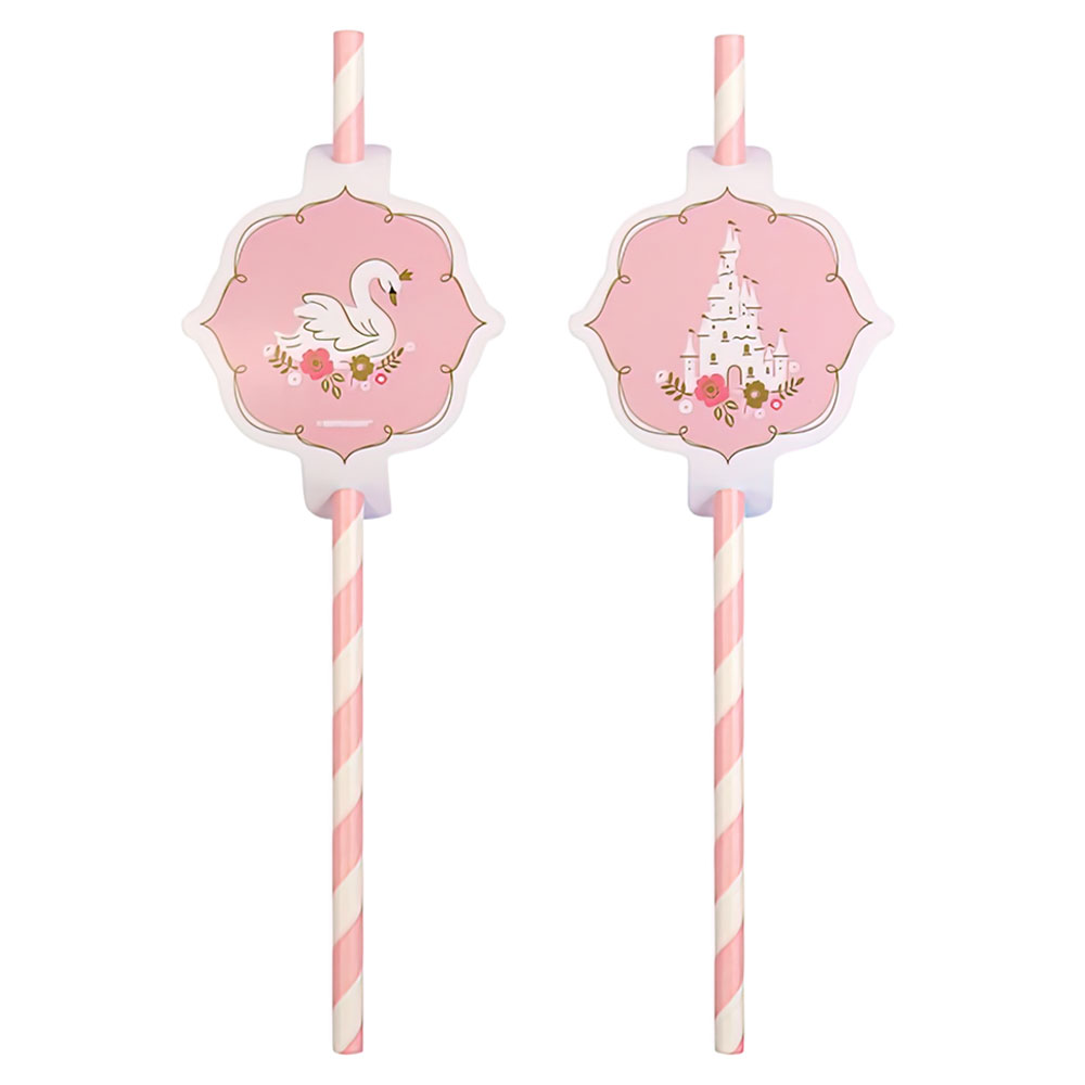 Prinsessa För En Dag Sugrör omfattar 8 stycken rosa och vit randiga papperssugrör med motiv föreställandes svanar och slott.