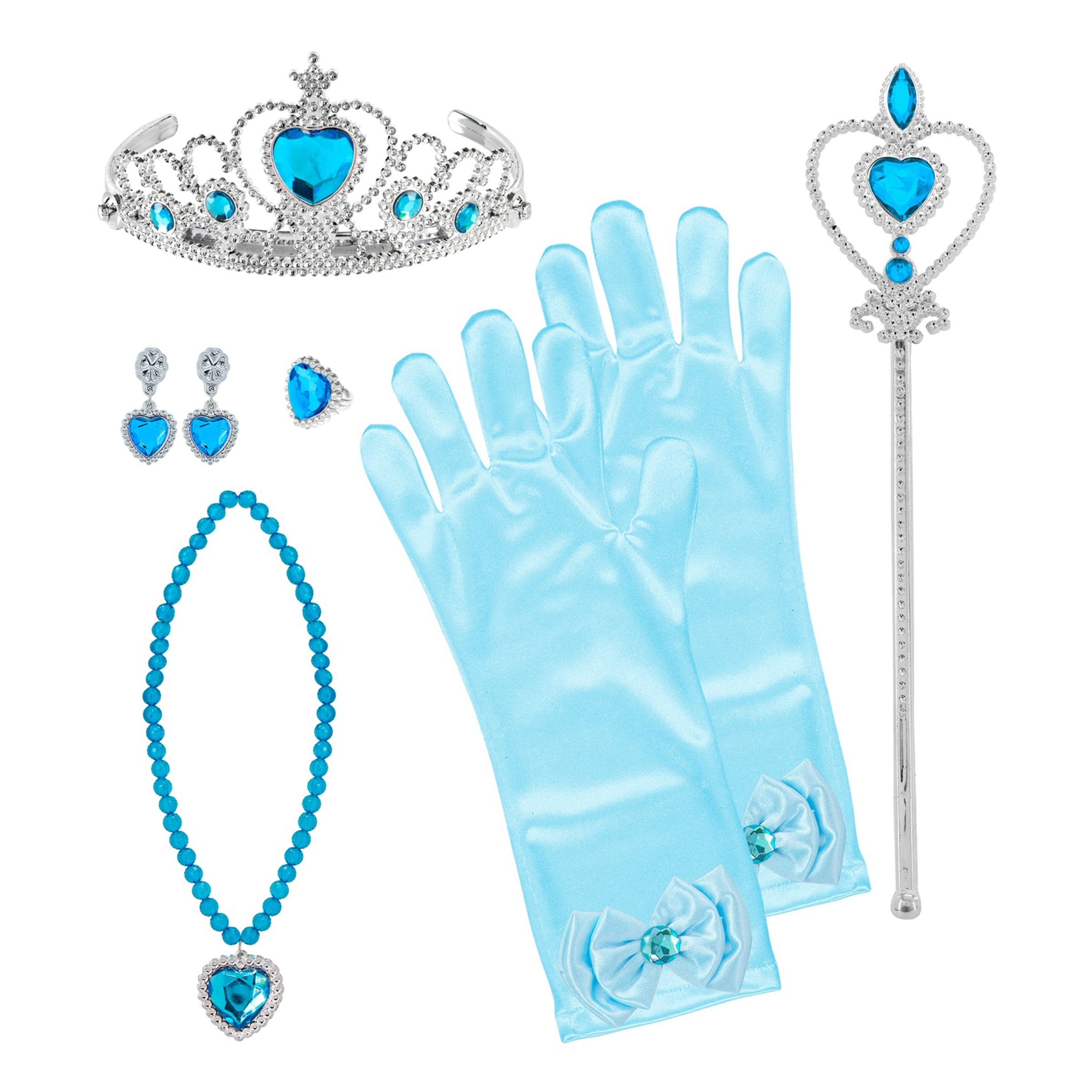 Prinsessa Tillbehörskit Blå för Barn inkluderar ett par satinhandskar, en spira, en tiara med blå stenar samt halsband, ring och örhängen även de i blått. Perfekt till leklådan hemma eller till prinsess-kalaset!