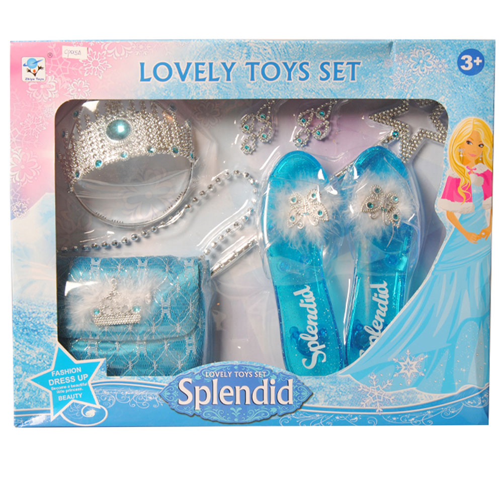 Prinsessset Blå omfattar ett prinsessset med ett par blå högklackade skor med silvriga fjärilar framtill, en blå handväska med silvrigt mönster och tiara symbol, silvriga örhängen och trollspö samt en silvrig tiara med blå strass. Skorna är 19 cm, vilket motsvarar skostorlek 28-30.