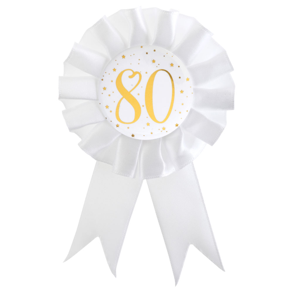 Gör dig riktigt snygg inför 80-års dagen med denna fina prisrosett! Stilfull rosett i vitt och guld som ser till att ingen kan missa att det är din 80-års dag i dag. Förutom en fin accessoar till dig själv kan den även bli en fin dekoration till festen, kort sagt ett perfekt festtillbehör till varje 80-års fest!