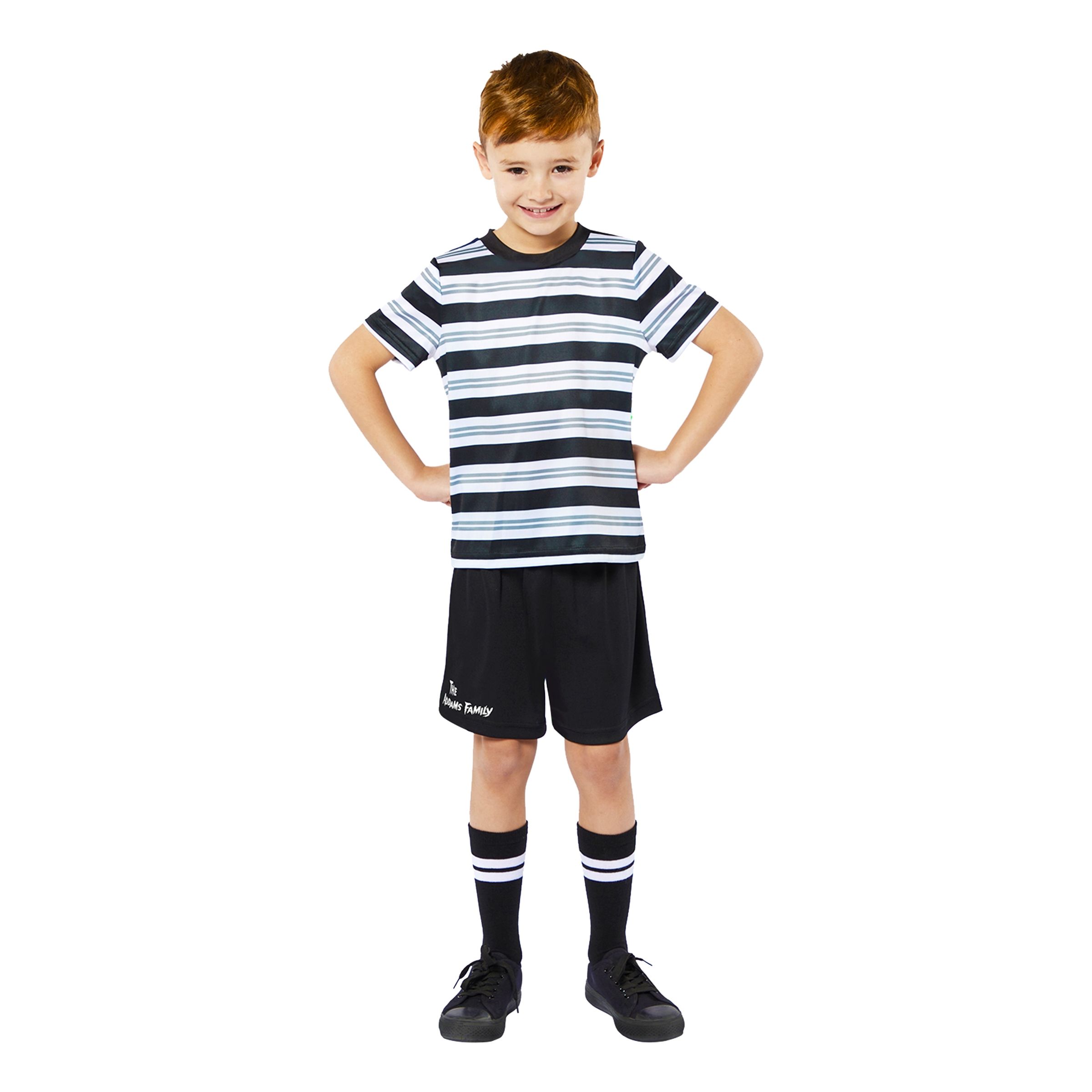 Pugsley Barn Maskeraddräkt inkluderar en randig topp i svart och vitt, ett par svarta shorts med texten "The Addams Family" på, samt ett par matchande strumpor. Perfekt till maskeraden!