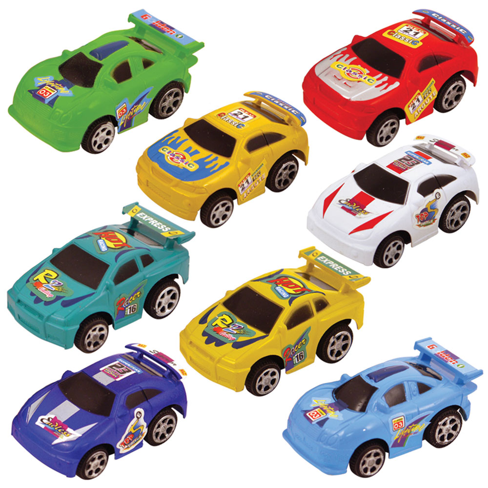 Pull Back Racerbil omfattar en racingbil med hjul och pull back funktion, dra bilen bakåt och släpp så åker den snabbt framåt. Racerbilarna finns i 8 st olika färger, har små skillnader på form och har olika stickers på sig men de säljs osorterade och styckvis så det blir en överraskning vilken variant du får.