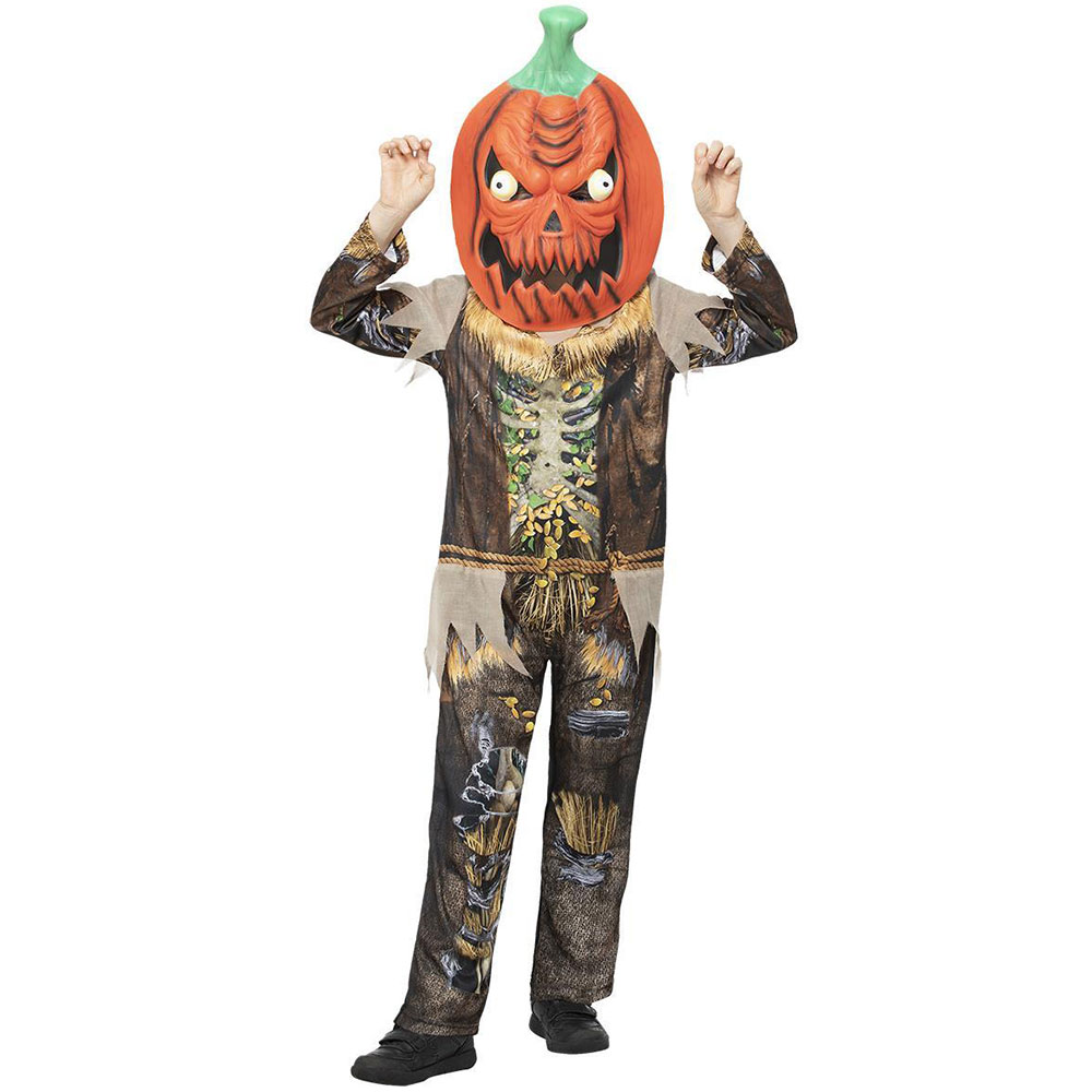 Pumpa Fågelskrämma Kostym Barn omfattar en jumpsuit med motiv att föreställa läskig fågelskrämma med nättygsdetaljer och en stor pumpaformad mask i EVA-plast som täcker halva ansiktet och hålls på plats med resårband.