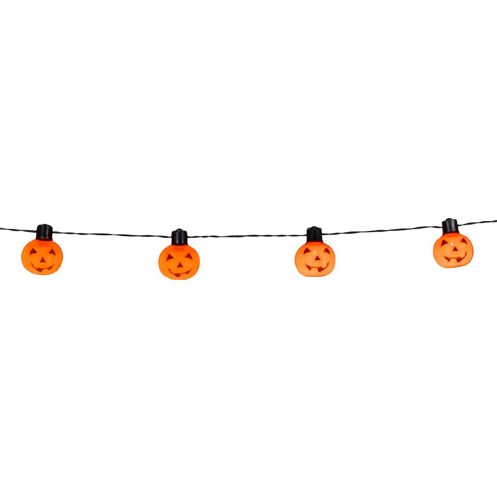 Pumpa Girlang LED omfattar en girlang med 10 stycken orange pumpor med svarta detaljer. Girlangen har LED belysning och drivs av två stycken AA-batterier. Pumpagirlangen är ca 175 cm lång och pumporna är ca 3,5 x 3,5 cm stora. Tillverkad i plast, endast för inomhusbruk.
