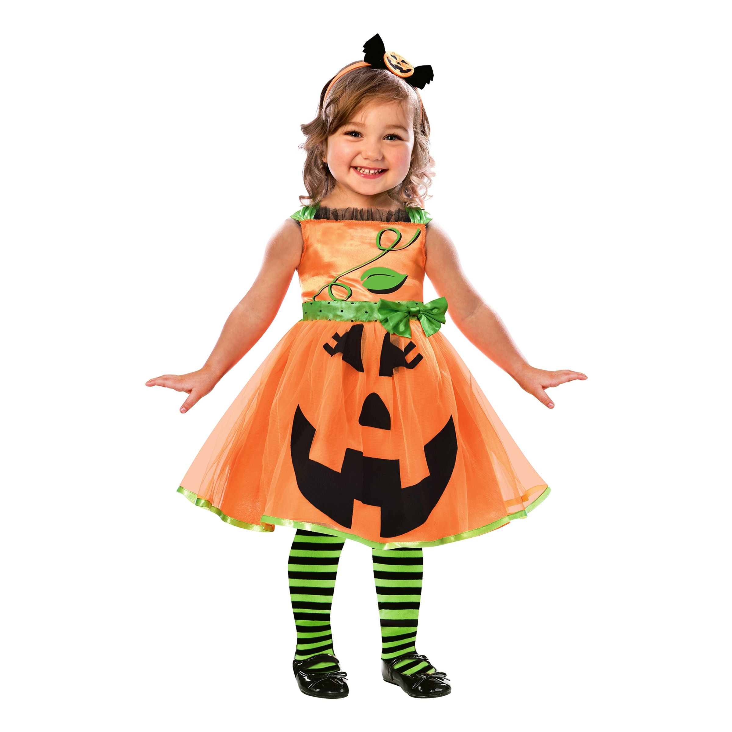 PumpaKlänning Barn Maskeraddräkt består av en orange skimrande klänning med tyllkjol och motiv av ett svart pumpaansikte på nederdelen. Klänningen kommer med gröna, fina detaljer och ett matchande diadem med liten pumpa.
