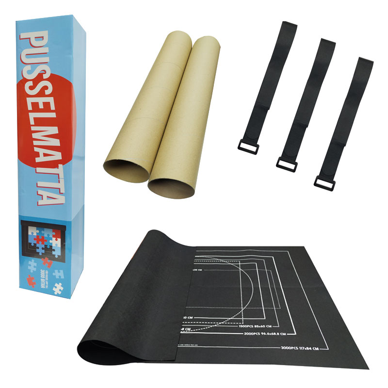 Pusselmatta omfattar en pusselmatta av filtliknande tyg som håller pusselbitarna på plats. När pusslet är färdigt kan du enkelt rulla ihop mattan och förvara det till nästa gång du vill lägga pussel.