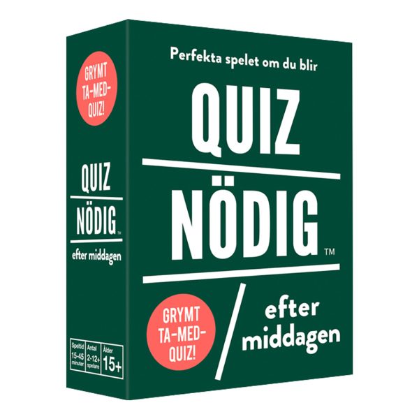 QuizNödig – Efter middagen är ett kul och avslappnat spel påfyllt med fler än 200 frågor för den perfekta avrundningen på en trevlig middag. Ett festligt sätt att umgås och en utmärkt ta-med-present. Inga krångliga regler och lika underhållande för par som större sällskap. Det perfekta spelet för en kul kväll helt enkelt!