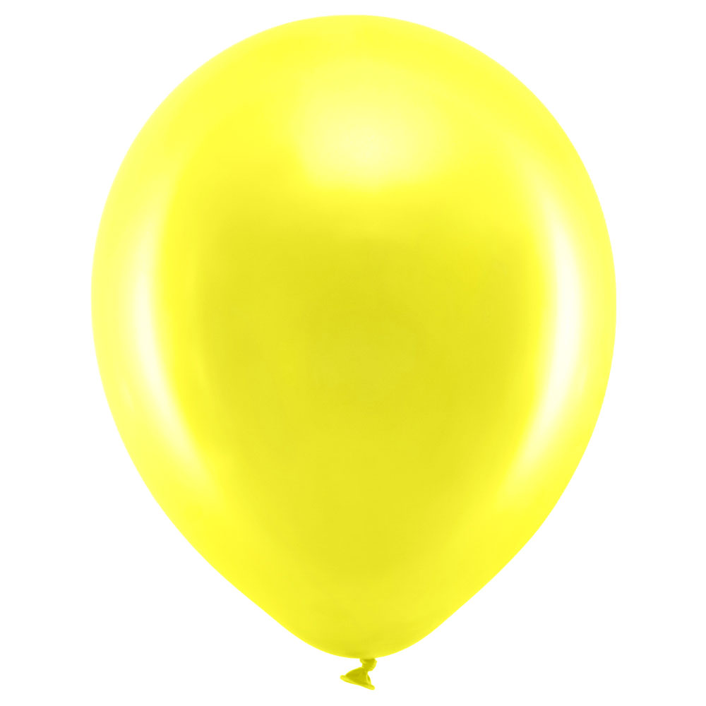 Rainbow Latexballonger Metallic Gula omfattar 10 stycken metallic gula latexballonger som mäter ca 30 cm i diameter. Blås upp ballongerna med luft eller helium.