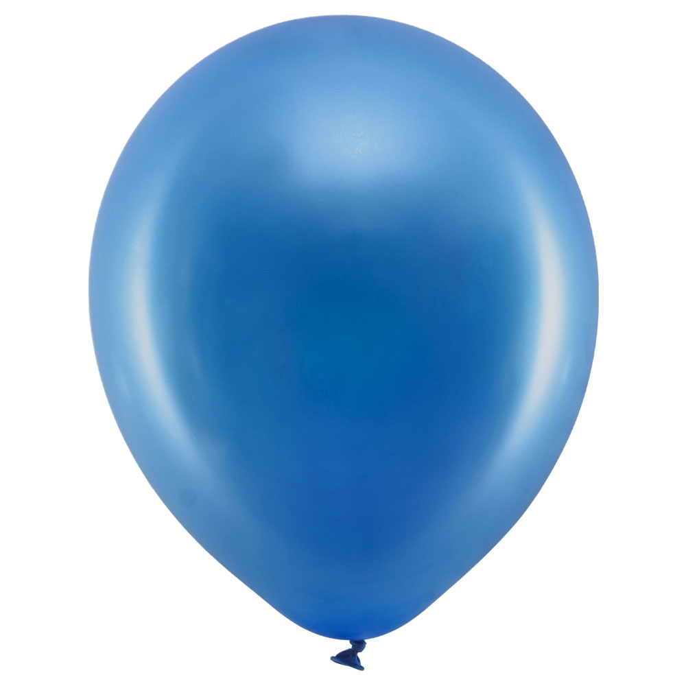 Rainbow Latexballonger Metallic Marinblåa omfattar 10 stycken metallic latexballonger i marinblått. Ballongerna fylls med luft eller helium och mäter ca 30 cm i diameter.