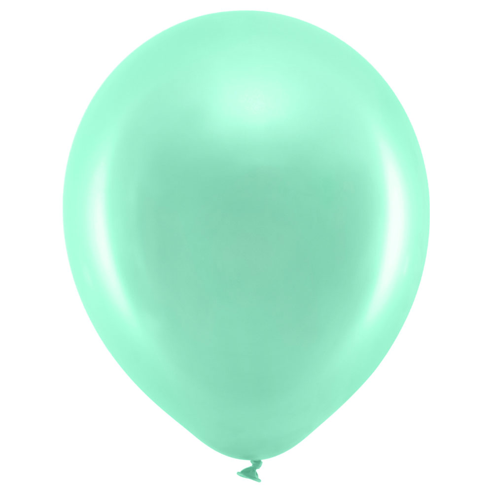 Rainbow Latexballonger Metallic Mintgröna omfattar 10 stycken metallic latexballonger i mintgrönt. Ballongerna fylls med luft eller helium och mäter ca 30 cm i diameter.