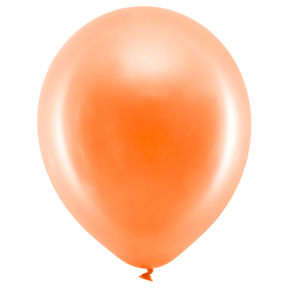Rainbow Latexballonger Metallic Orange omfattar 10 stycken metallic latexballonger i orange. Ballongerna fylls med luft eller helium och mäter ca 30 cm i diameter.