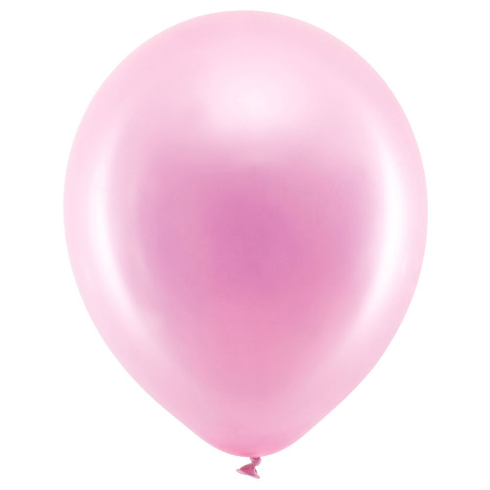 Rainbow Latexballonger Metallic Rosa omfattar 10 stycken metallic rosa latexballonger som mäter ca 30 cm i diameter. Blås upp ballongerna med luft eller helium.