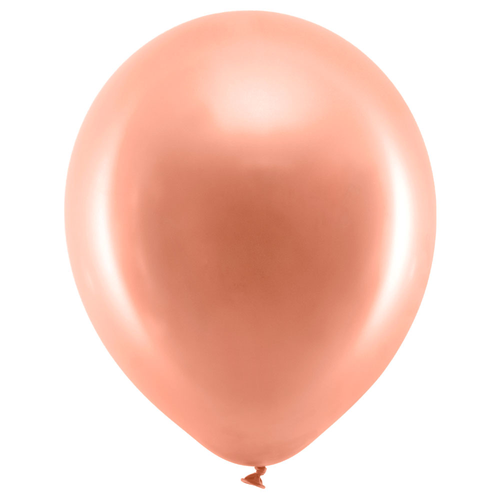 Rainbow Latexballonger Metallic Roséguld omfattar 10 stycken metallic latexballonger i roséguld. Ballongerna fylls med luft eller helium och mäter ca 30 cm i diameter.
