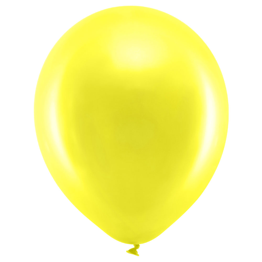 Rainbow Små Latexballonger Metallic Gula omfattar 10 stycken metallic latexballonger i gult. Ballongerna mäter ca 23 cm i diameter och fylls med luft eller helium.