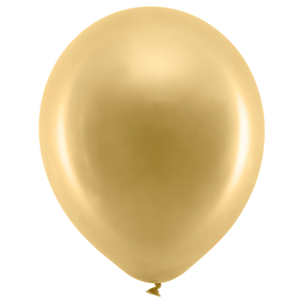 Rainbow Små Latexballonger Metallic Guld omfattar 10 stycken metallic guldiga latexballonger som mäter ca 23 cm i diameter. Blås upp ballongerna med luft eller helium.