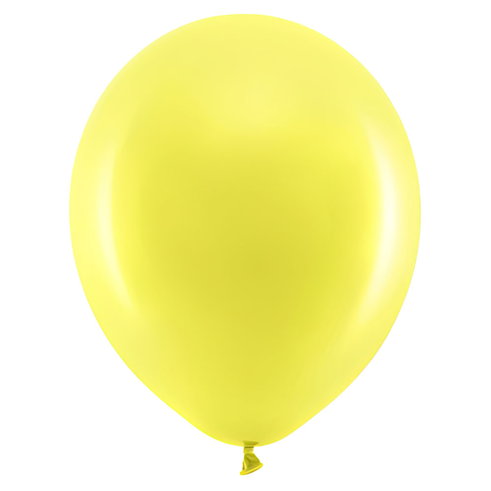 Rainbow Små Latexballonger Pastell Gula 100-pack omfattar 100 stycken pastell gula latexballonger som mäter ca 23 cm i diameter. Blås upp ballongerna med luft eller helium.