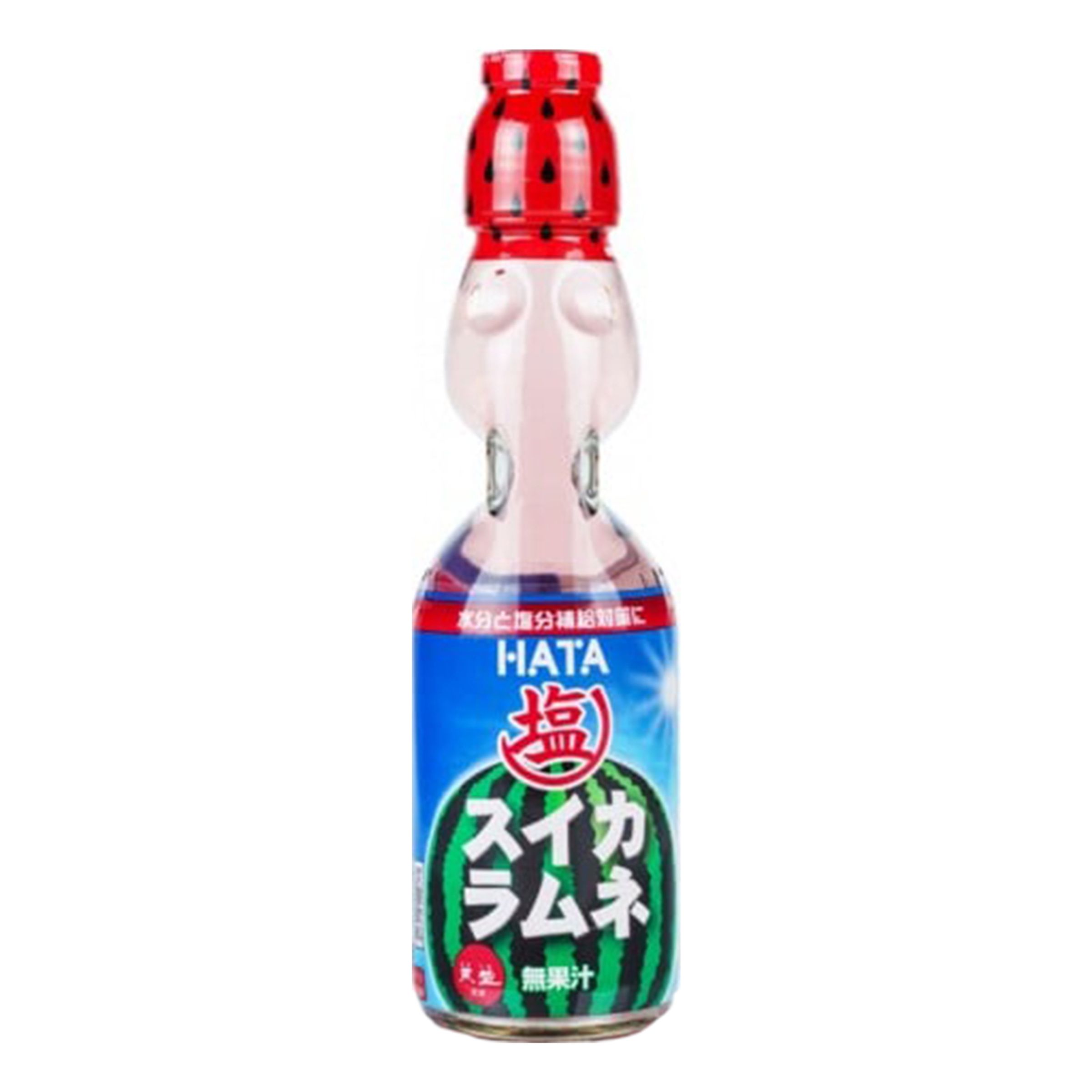 Ramune Watermelon är en populär japanskt läsk med smak av vattenmelon som kommer i en unik glasflaska som öppnas genom att man trycker ner en liten glaskula. Hur undrar du? Dra av bara av plasten från korken, använd sedan plastringen till att trycka ner kulan och håll kvar några sekunder. Njut!