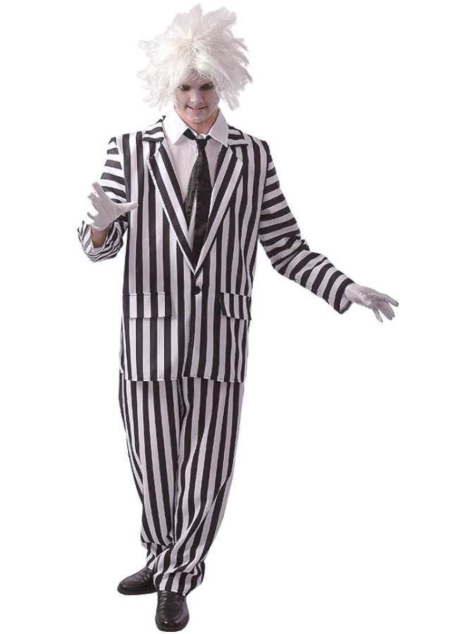 Känns en vanlig svart kostym lite för alldagligt och tråkigt passar nog den här snyggt randiga kostymen mycket bättre! Svart-vit randig kostym med kavaj, byxor och slips som blir en utmärkt kostym till både maskerad och halloween. Med den här kostymen kan du enkelt få till en hel del olika typer av utklädnader i cirkus tema.