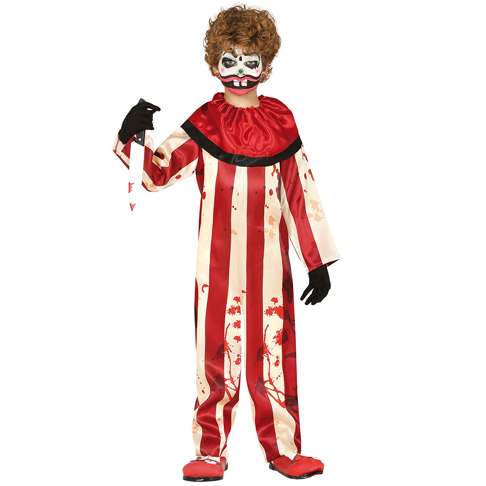 Randig Clown Maskeraddräkt Pojke omfattar en clown barndräkt med blodfläckar. Dräkten inkluderar en randig krämvit och röd jumpsuit med krage.