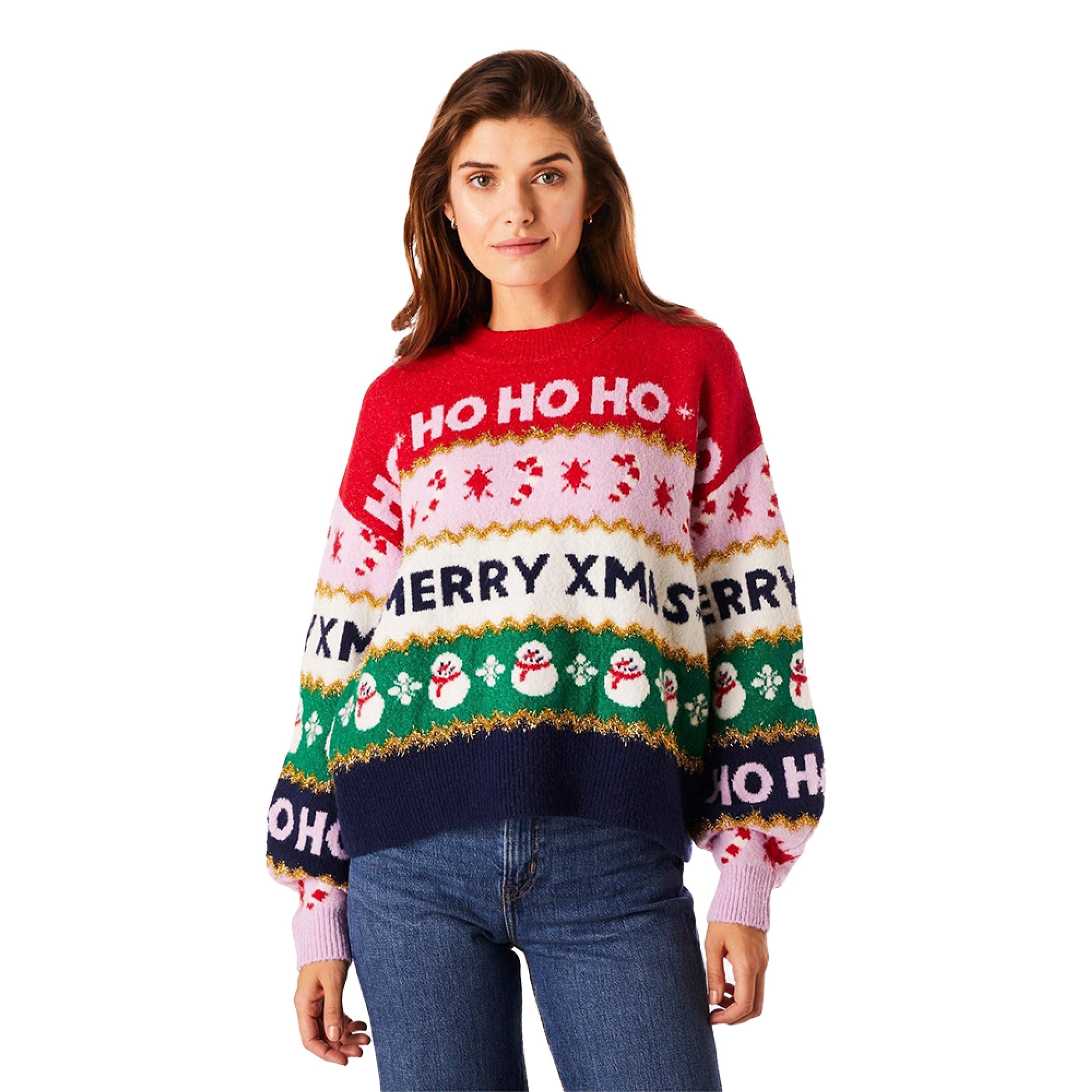 Randig Oversize Jultröja Dam är en superfin stickad röd jultröja med olika tjusiga julmotiv i olika färger och texten "ho ho ho" samt "Merry X-mas". Jultröjan kommer i mysig oversize-modell och är både varm och mjuk att ha på sig. Perfekt jultröja som passar både för hemmamys i jul eller till julbordet!
