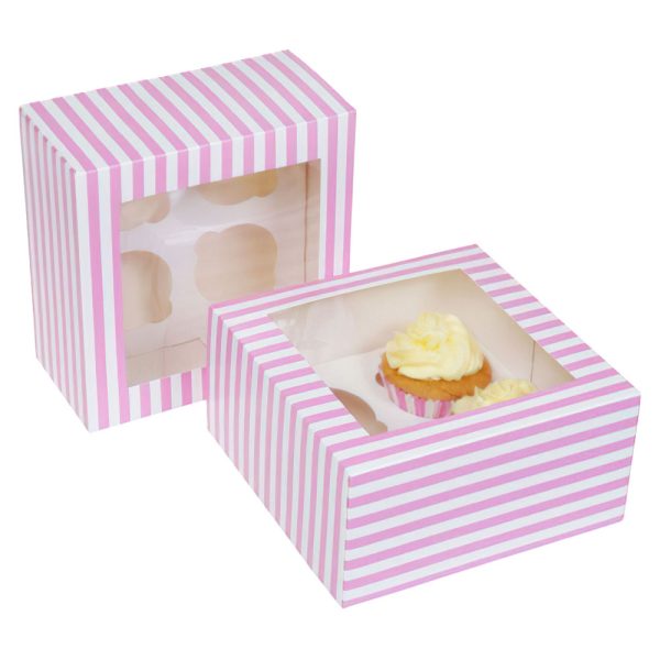 Randiga Cupcake Kartonger Rosa och Vit består av två stycken randiga cupcake kartonger i vitt och rosa med plats för fyra cupcakes i varje. Kartongerna är tillverkade av papp och är ca 17,8 cm långa, 17,8 cm breda och 9 cm höga.