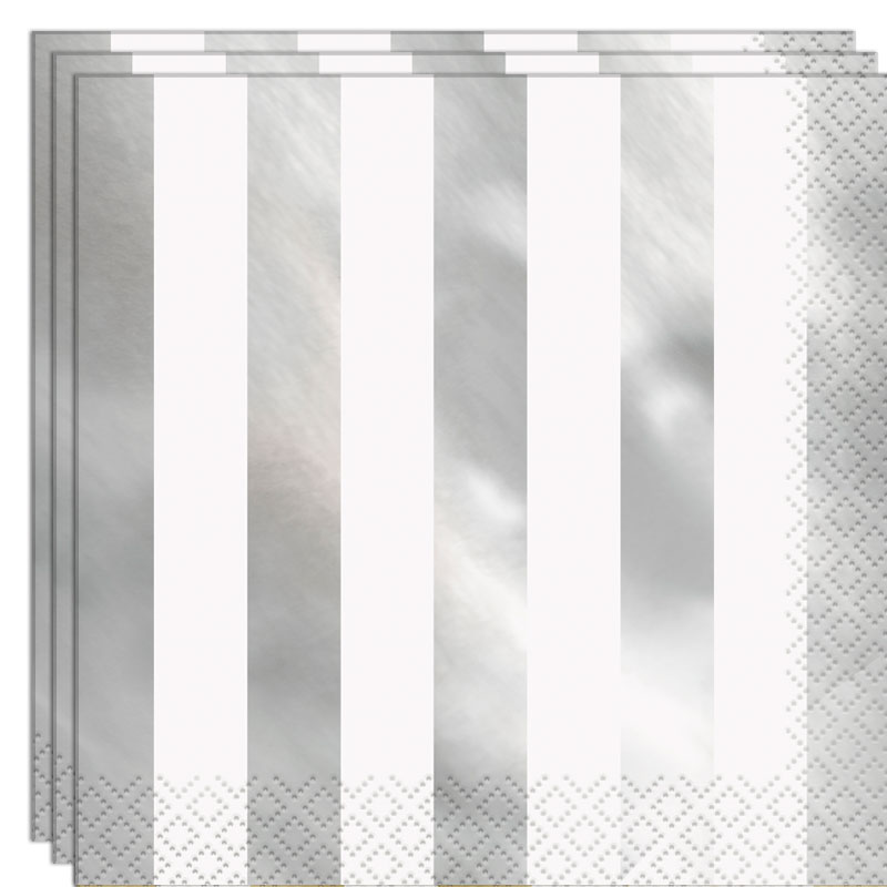 Randiga Servetter Silver/Vit består av vit- och silverfärgade servetter i randigt utförande. De silverfärgade ränderna är dessutom tillverkade av foliematerial och ger ifrån sig ett härligt skimrande i omgivningen.