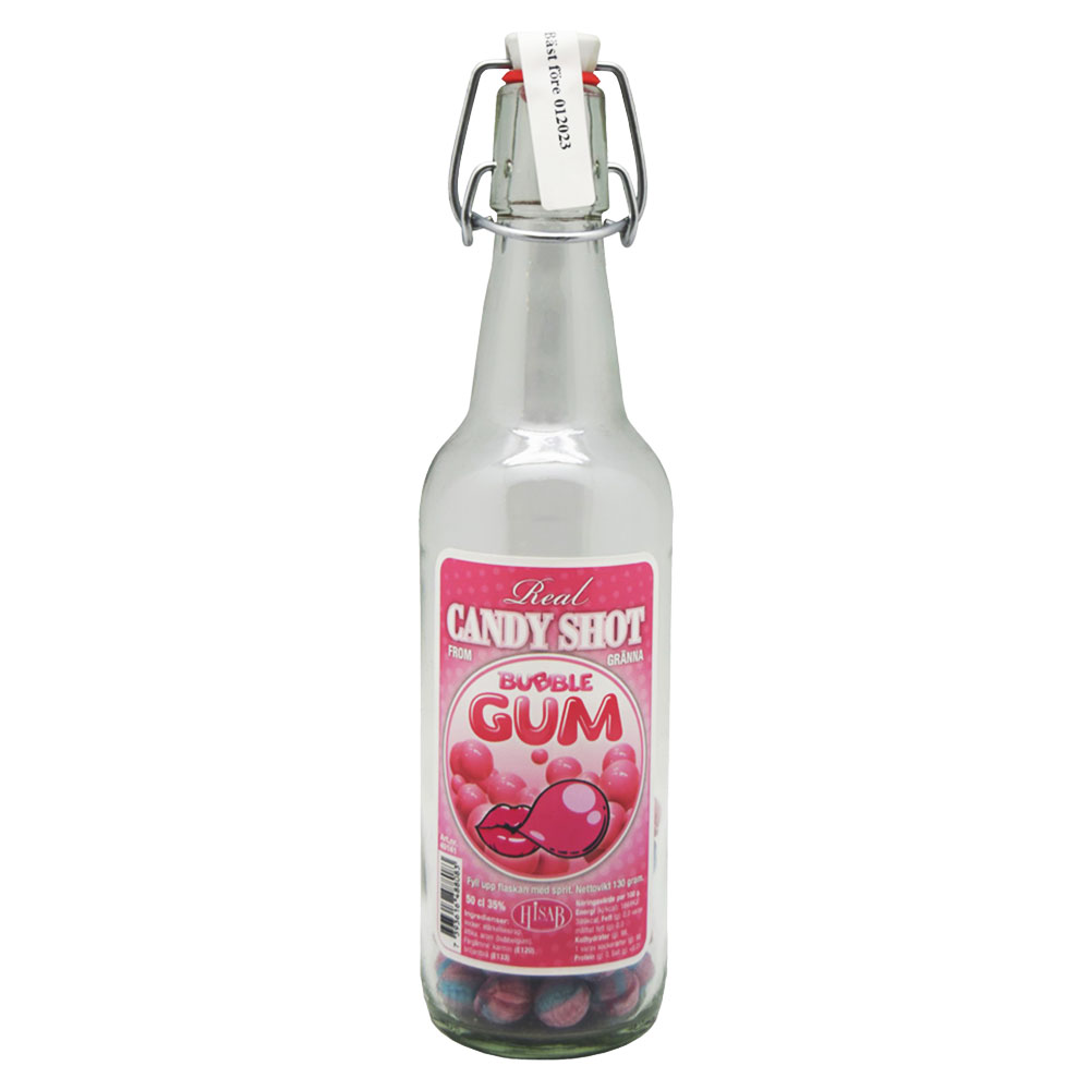 Real Candy Shot Bubblegum omfattar en glasflaska med bubbelgum-godis att göra egen godisshot med. Flaskan rymmer ca 50 cl och fylls med valfri spritsort. Godisshoten är klar när karamellerna har lösts upp.