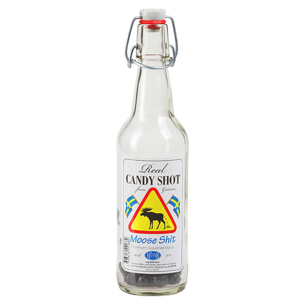 Real Candy Shot Moose Shit omfattar en glasflaska med lakritsgodis att göra egen godisshot med. Flaskan rymmer ca 50 cl och fylls med valfri spritdryck. Godisshoten är klar när godiset lösts upp.