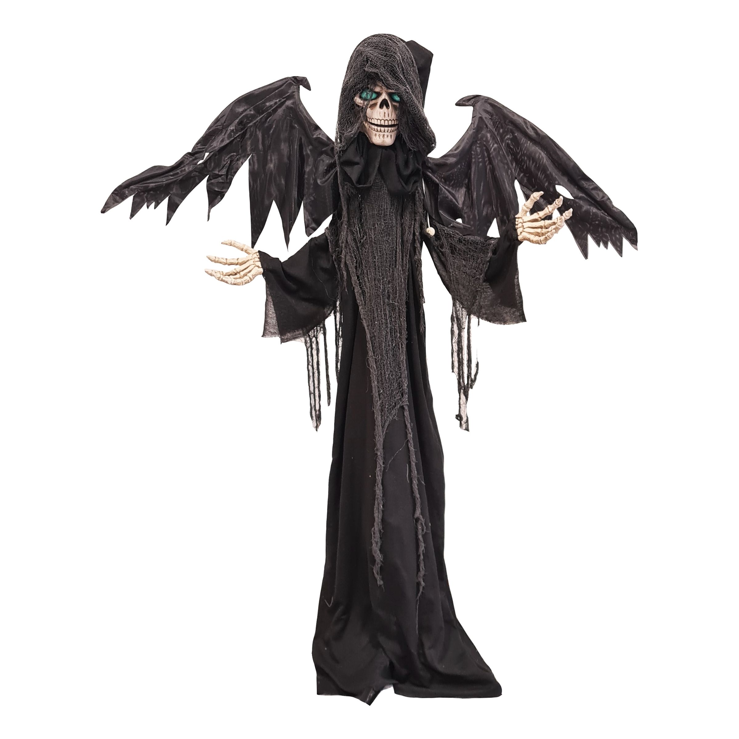 Reaper med Vingar Animerad Prop är en otroligt kuslig halloweenprop med såväl rörelse som ljud och ljus. Vid aktivering via ON/OFF-knappen rör sig liemannen till läskiga ljud och blinkar med ögonen. En oerhört välgjorde dekoration som garanterat kommer maxa halloweenfesten!