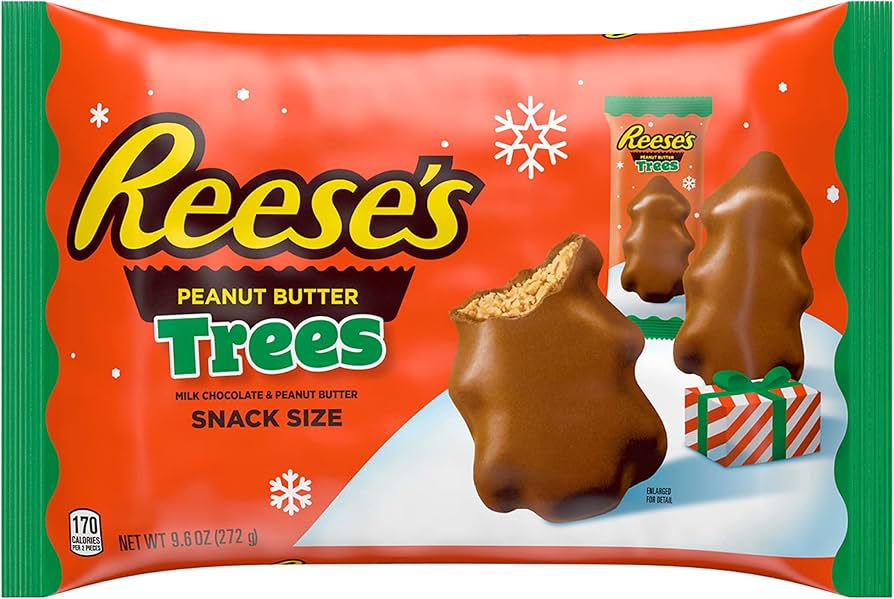 Reese's Peanut Butter Trees: Julgransformade godsaker med den klassiska Reese's-smaken. Krämigt jordnötssmör omgivet av mjuk mjölkchoklad i en festlig form. Perfekta för julstrumpan, som present eller för att njuta själv under helgerna. En säsongsbetonad version av den älskade amerikanska godisklassikern.
