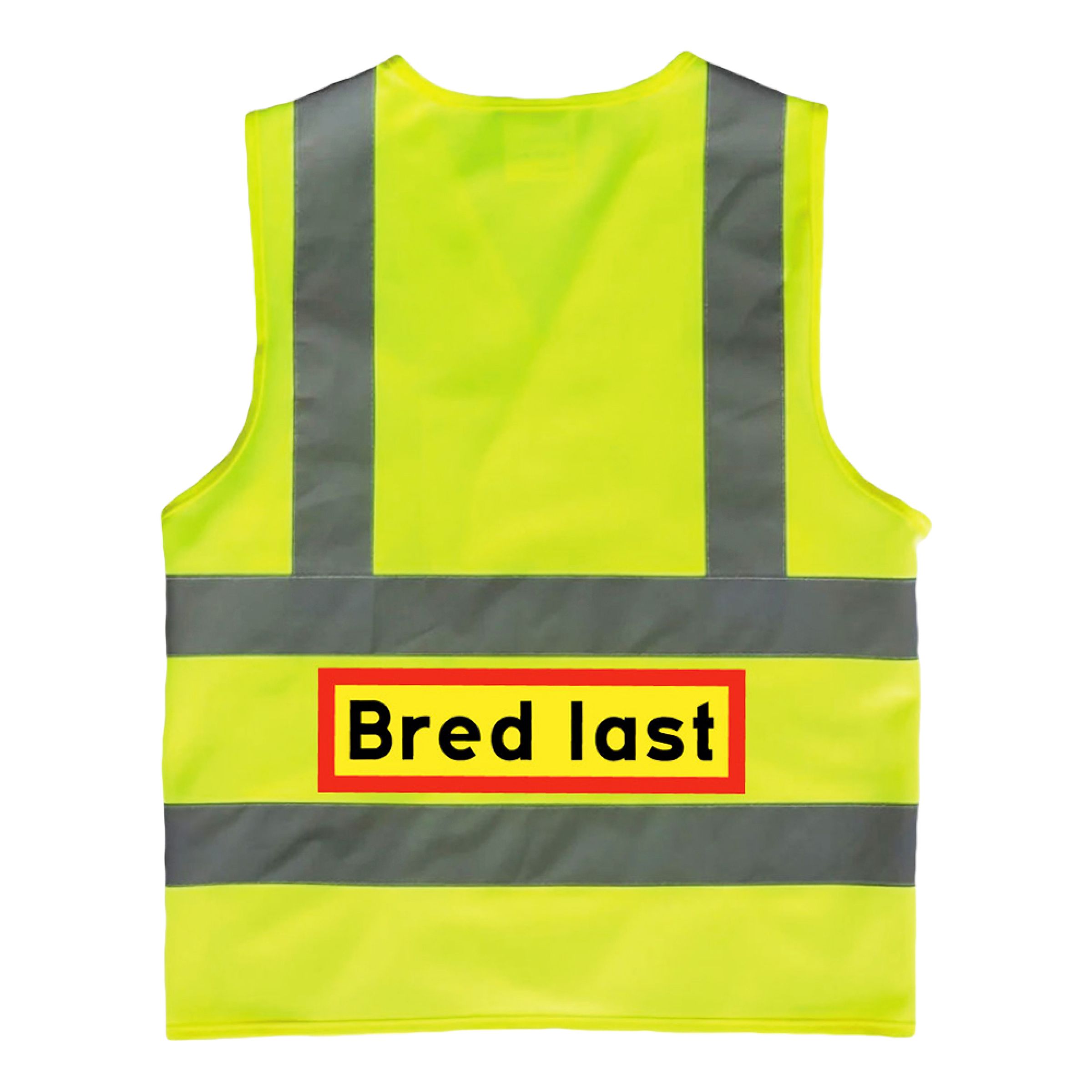 Reflexväst BRED LAST är en neongul varselväst med texten "Bred Last" på. Västen lyser upp i mörkret och sitter bekvämt runt kroppen.