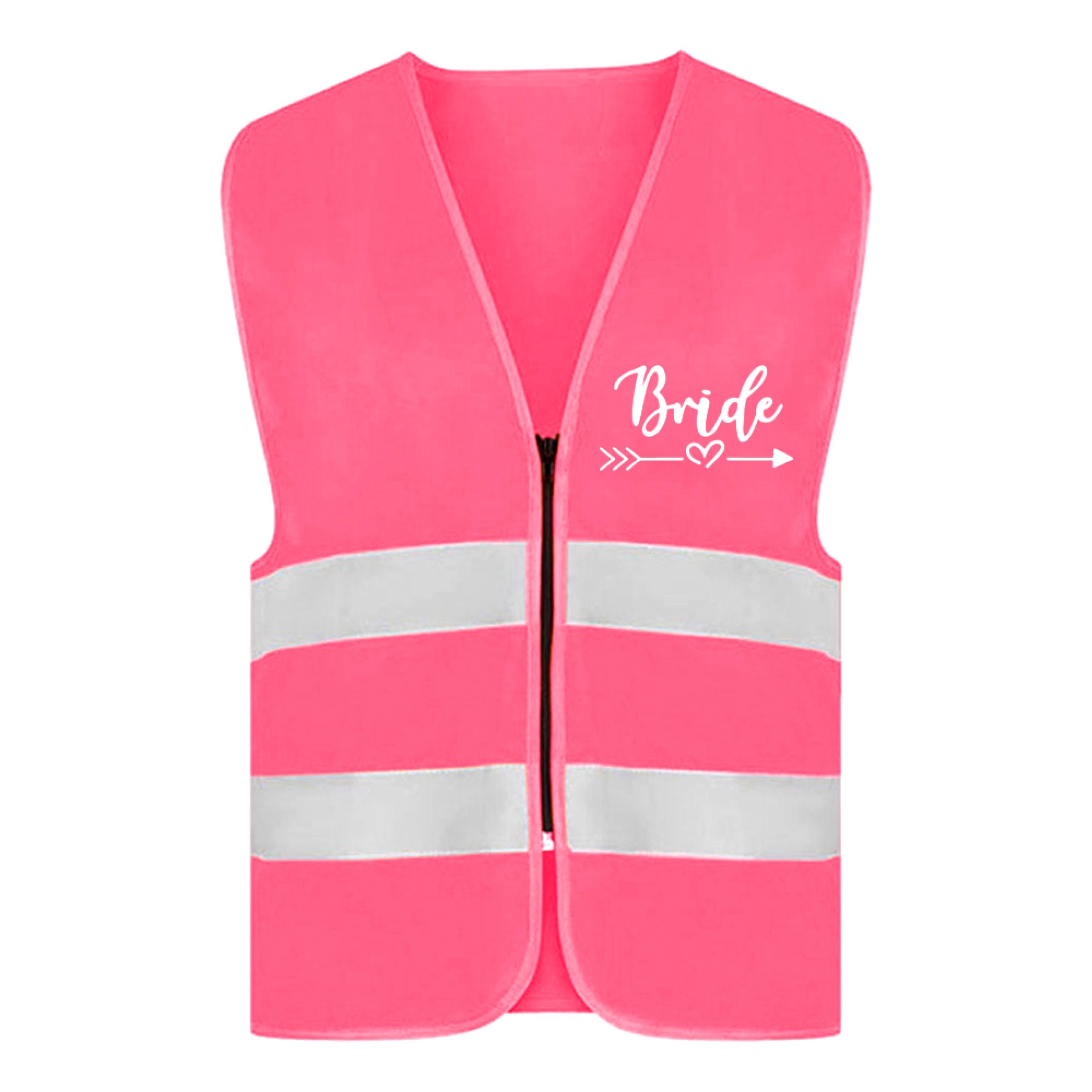 Reflexväst Bride är en rosa reflexväst som det står "Bride" på bröstet och på ryggen. Västen stängs med dragkedja framtill. Perfekt att ha till möhippan!
