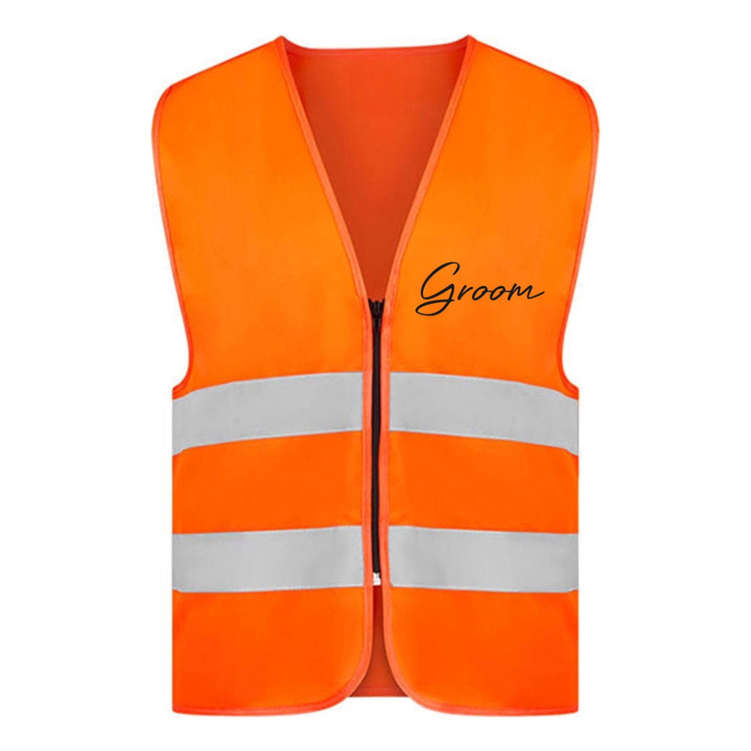 Reflexväst Groom är en orange reflexväst som det står "Groom" på bröstet och på ryggen. Västen stängs med dragkedja framtill. Perfekt att ha till svensexan!