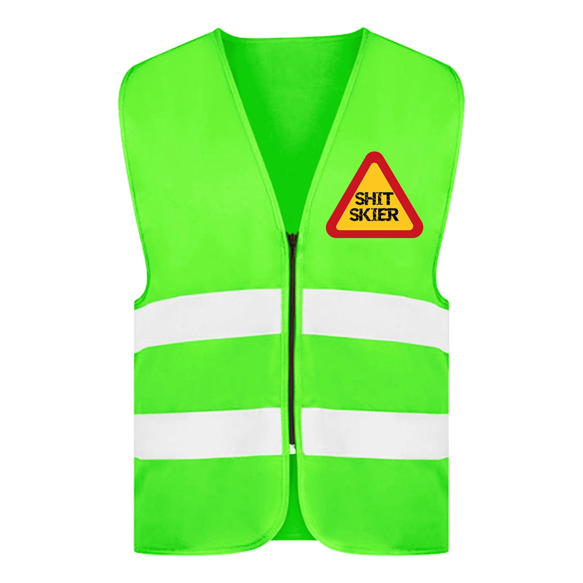 Reflexväst Shit Skier Neongrön är en neongrön varselväst som kommer med texten "Shit skier" skrivet på vänstra sidan om bröstet och på ryggen. Västen lyser upp i mörkret och sitter bekvämt runt kroppen när man vurpar i backen.