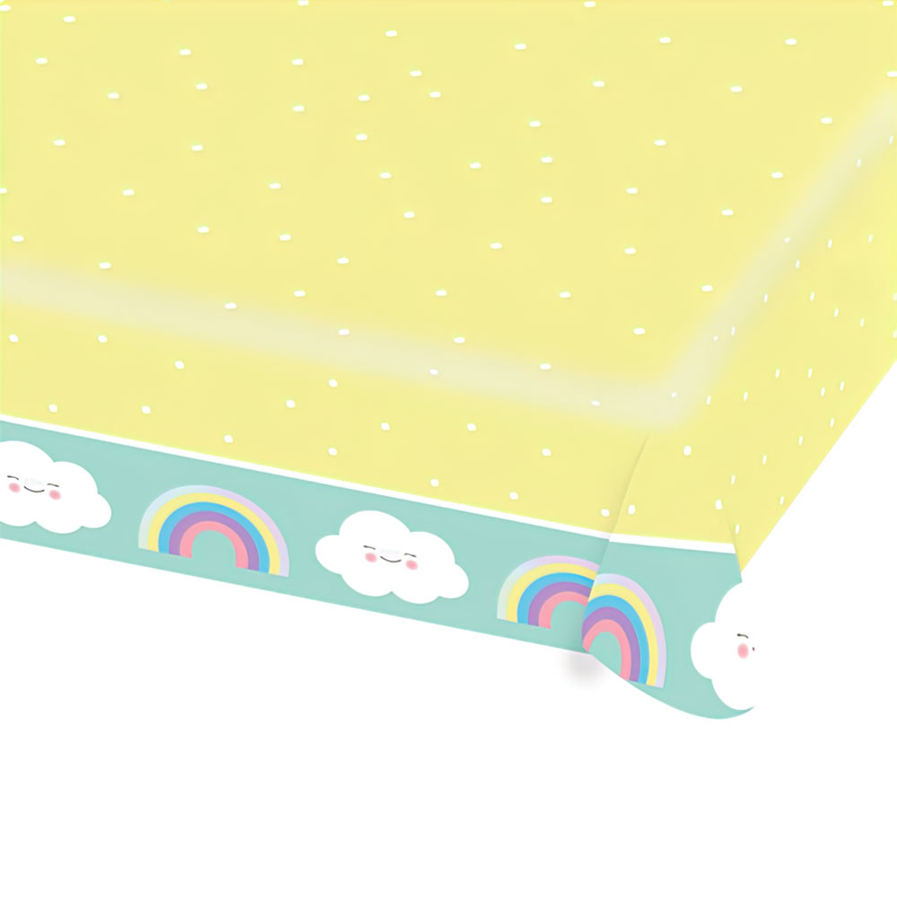 Regnbåge Pappersduk omfattar en gul pappersduk med vita prickar, och en grön kant med leende moln och regnbågar i pastellfärger. Duken är ca 1,75 x 1,15 m stor.