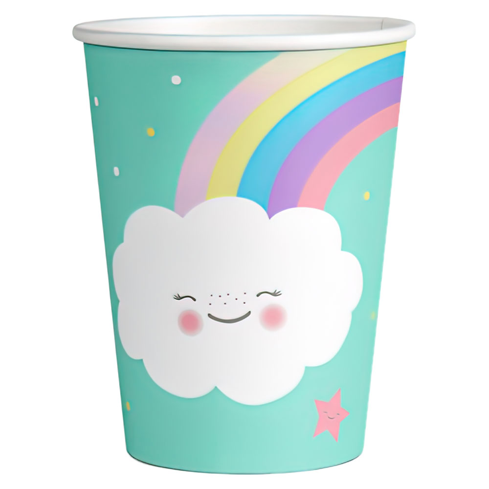 Vad är ett kalas utan saft och läsk? Och vad är ett regnbågskalas utan passande muggar för barnen att dricka ur? Om du vill slippa ta reda på det är det bäst att du köper det här paketet med söta muggar med glada moln och regnbåge på. Roliga pappmuggar som passar bra till kalas-dukningen och som sprider en härlig stämning.