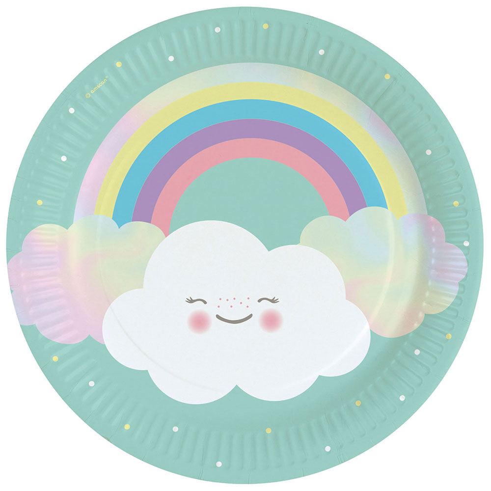 Regnbåge Papperstallrikar omfattar pastellblå tallrikar med motiv av ett glatt moln i vitt med regnbåge och moln i pastellfärger. Tallrikarna är tillverkade i papp och är ca 23 cm stora. Säljs i 8-pack.