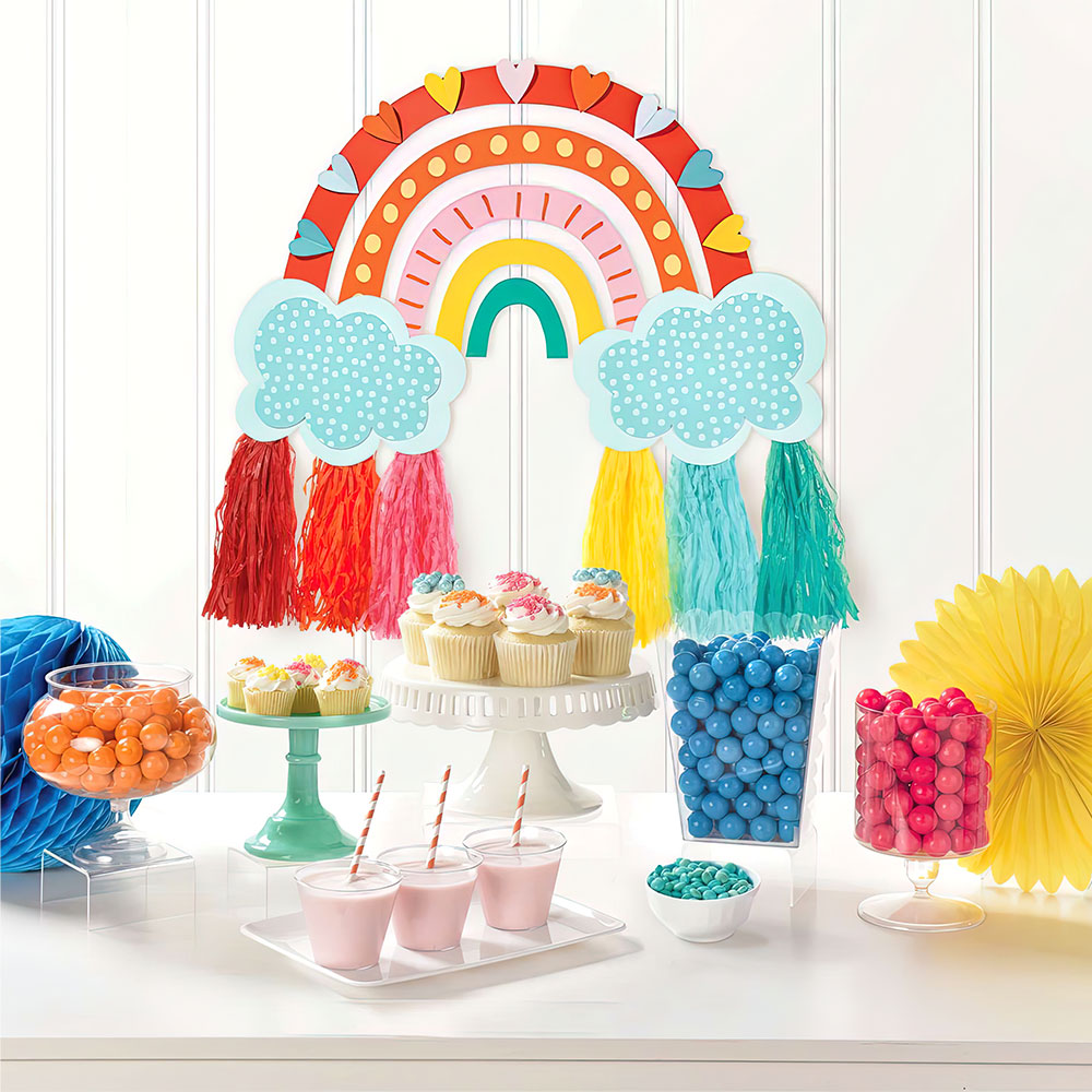 Fixa ett riktigt wow firande med denna färgglada väggdekoration i snygg retro stil med regnbåge och moln i fint mönster! En superhärlig väggdekor med regnbåge i snygg och annorlunda stil, som passar såväl barn som vuxna, en perfekt dekoration för fest och såklart regnbågskalas!