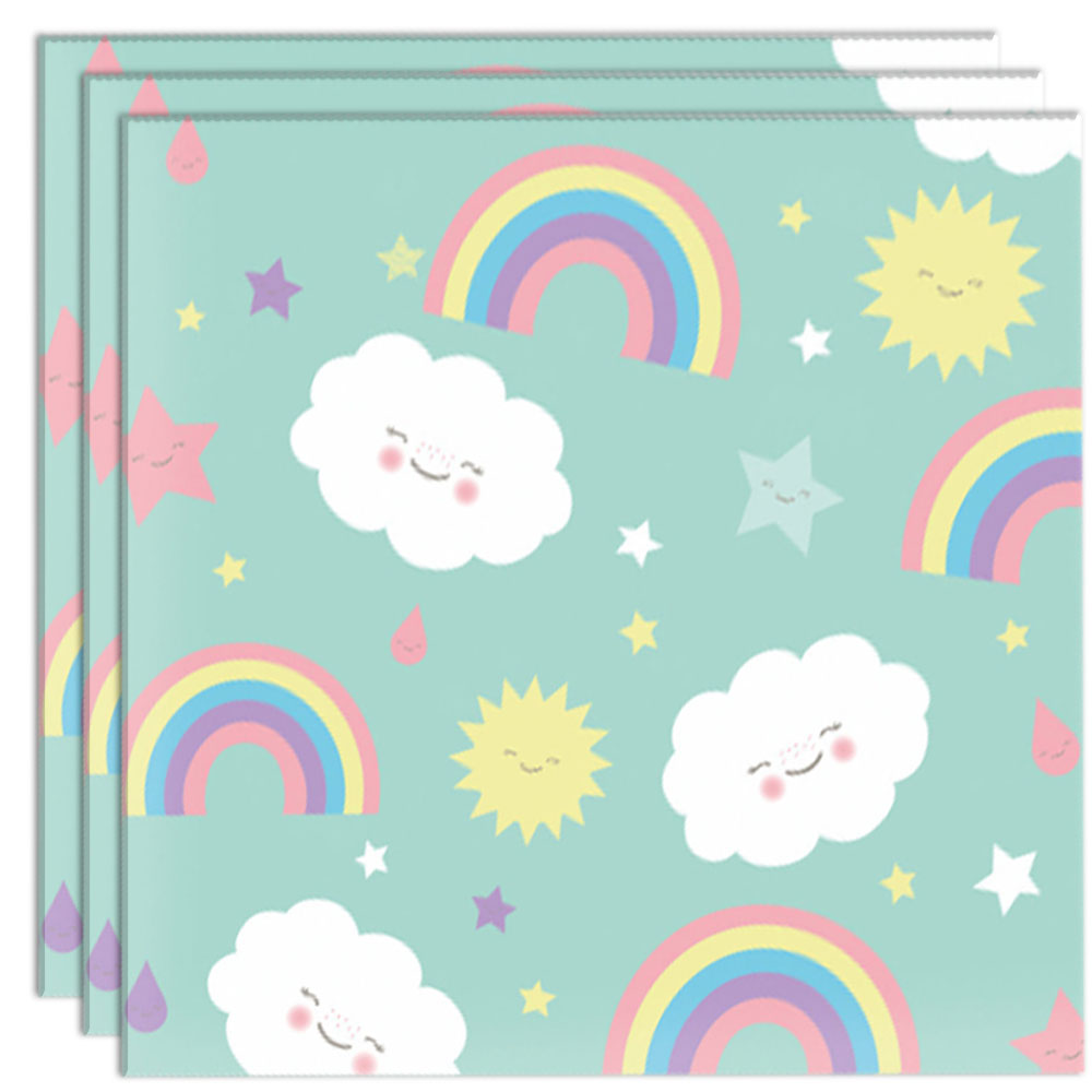 Regnbåge Servetter omfattar 20 stycken gröna kaffeservetter med färgglatt tryck av regnbågar, moln, solar och stjärnor. Servetterna är ca 33 cm stora.