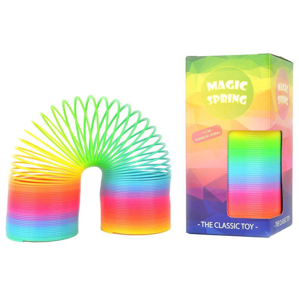 Upptäck glädjen med denna regnbågsfärgade Slinky leksak, en ikonisk klassiker som har förtrollat generationer. Med dess spännande spiralform och rytmiska rörelser är den redo att vandra ner för trappsteg som den underhållande trappfjädern den är. Från topp till tå visar denna slinky fram den förtrollande färgrikedomen i en regnbåge, vilket gör den till en färgstark favorit för barn i alla åldrar.