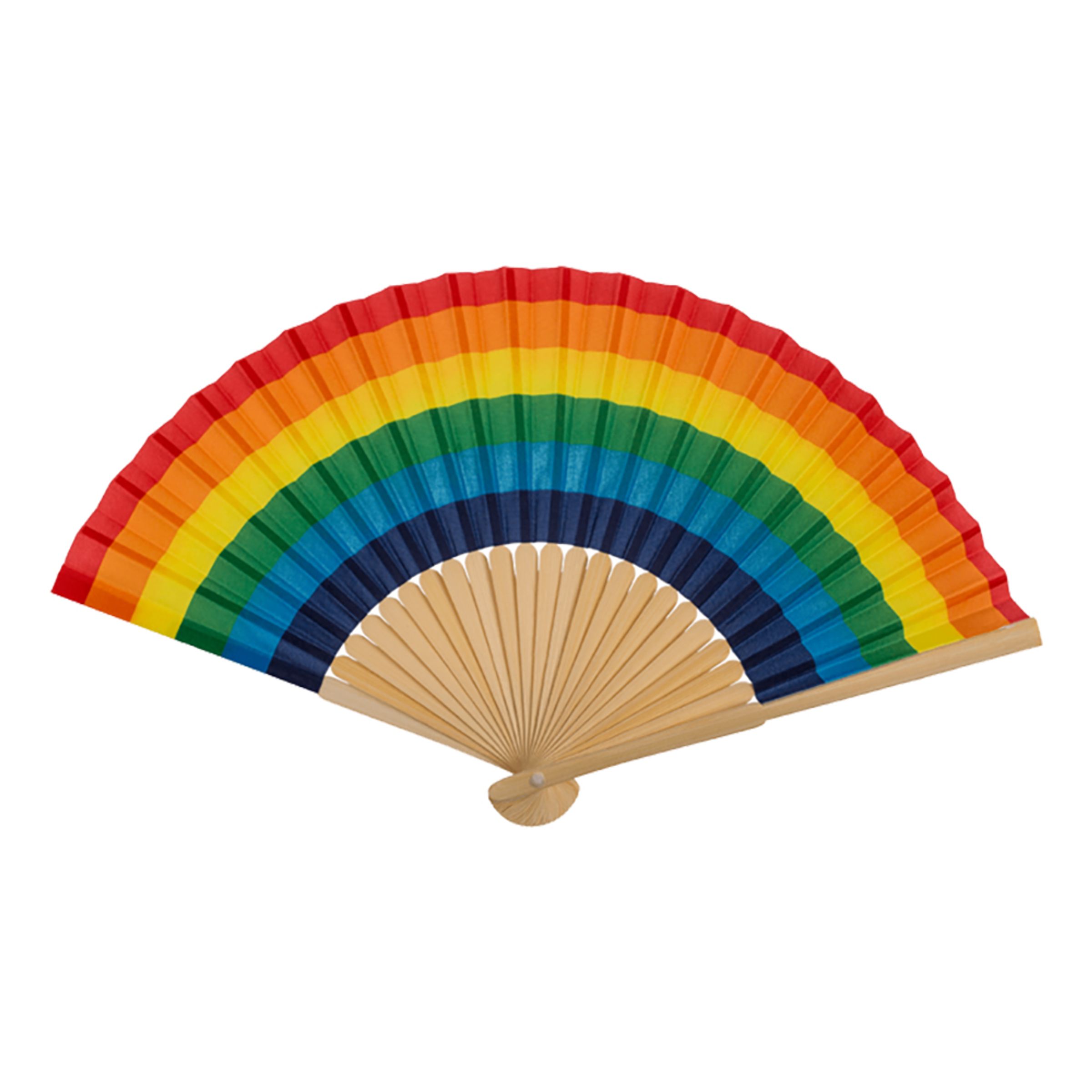 Regnbågsfärgad Solfjäder i Bambu är brun nedtill och har regnbågens färger upptill i ett snyggt mönster. Perfekt som accessoar till Pridefestivalen eller att ta med dig på stranden när du vill fläkta dig lite extra.