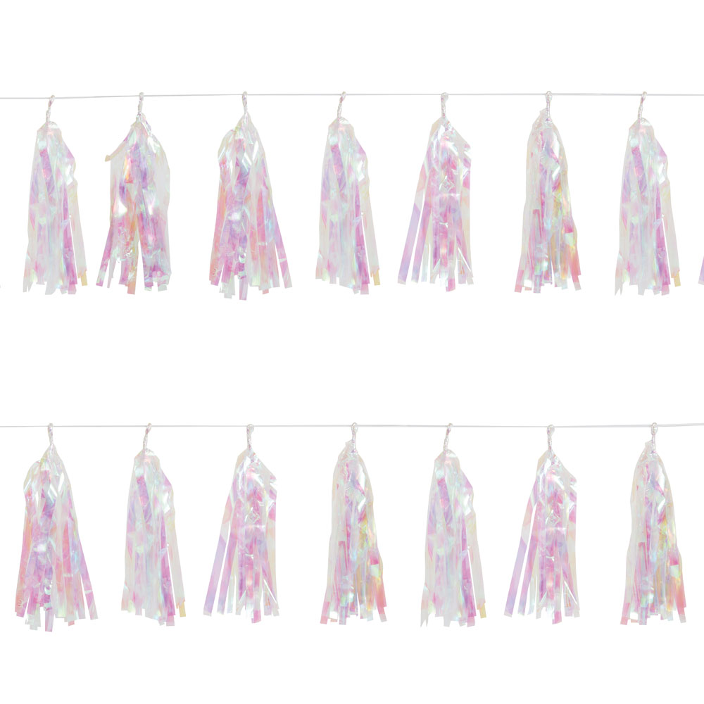Regnbågsskimrande Girlang med Tofsar består av en girlang med 15 stycken regnbågsskimrande tofsar. Häng upp girlangen i taket, mot en vägg eller på något annat passande ställe. Girlangen är tillverkad i plast och hängs upp med ett vitt snöre.