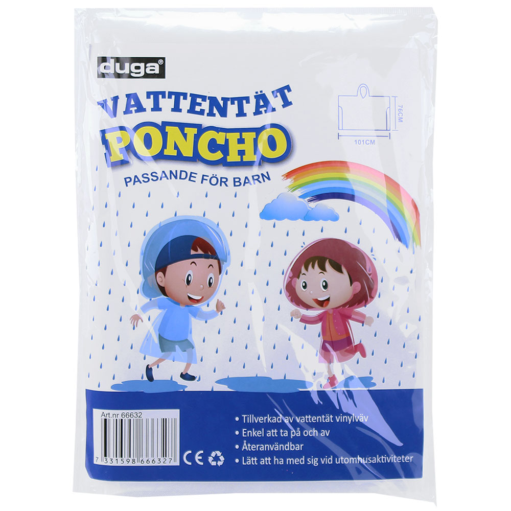 Regnponcho Barn omfattar en vattentät regnponcho i barnstorlek. Ponchon är ca 101 cm bred och 76 cm lång och är återanvändningsbar.