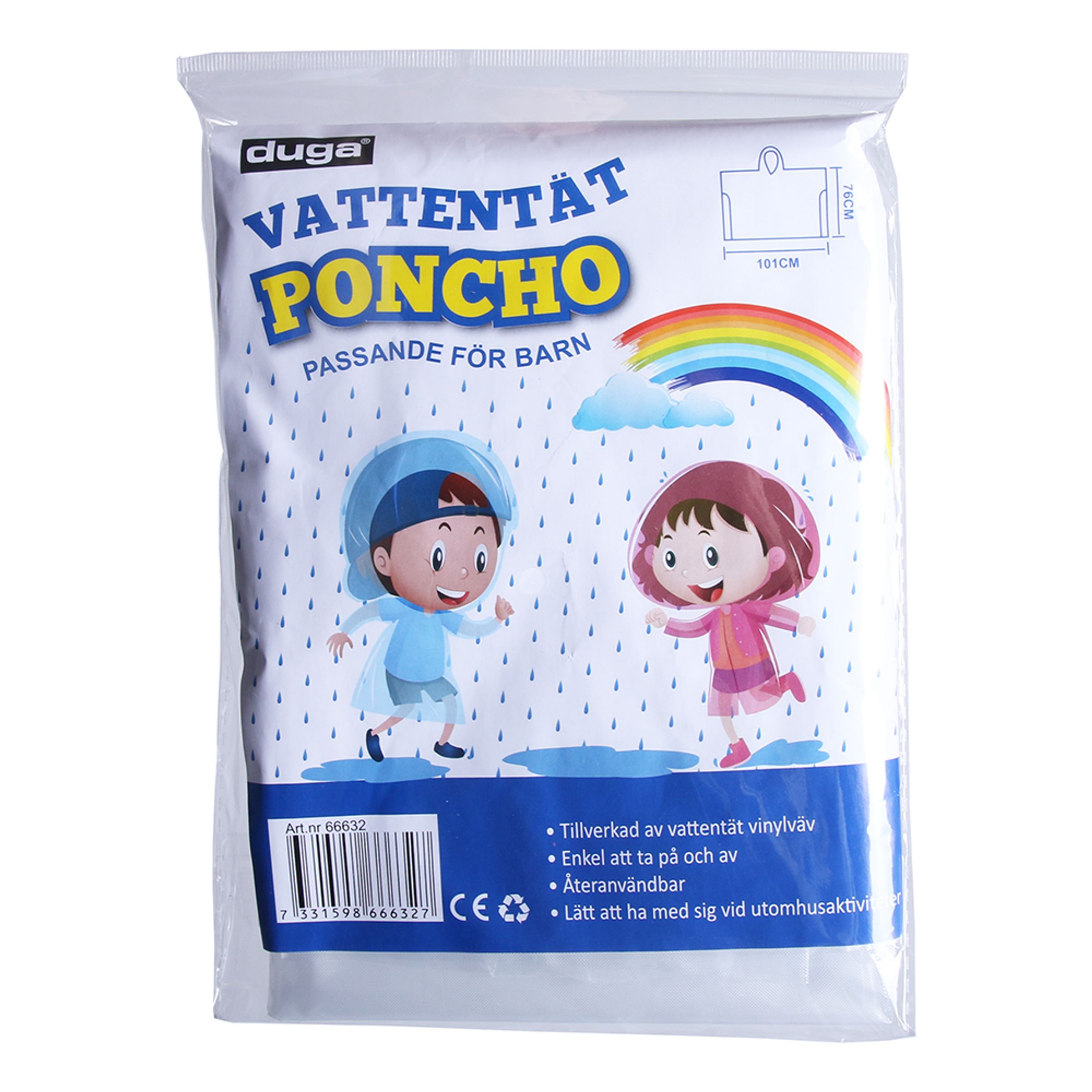 Regnponcho Transparent för Barn är en genomskinlig, återanvändbar poncho med huva som skyddar bra mot regn. Ponchon säljs styckvis.
